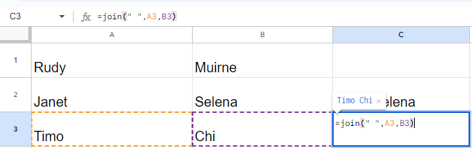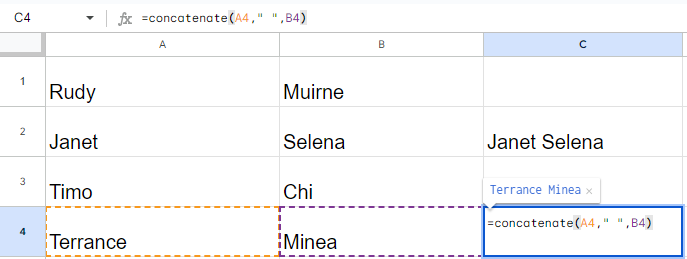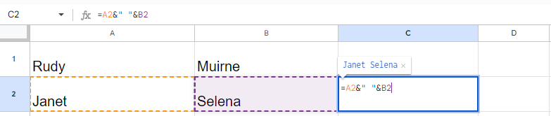And voila! Your first and last names are now joined together with a little space in between. Isn't that easy-peasy? It's like magic, but without the wand. You've just taken your first step into the world of Google Sheets formulas, and trust me, there's a whole lot more where that came from!