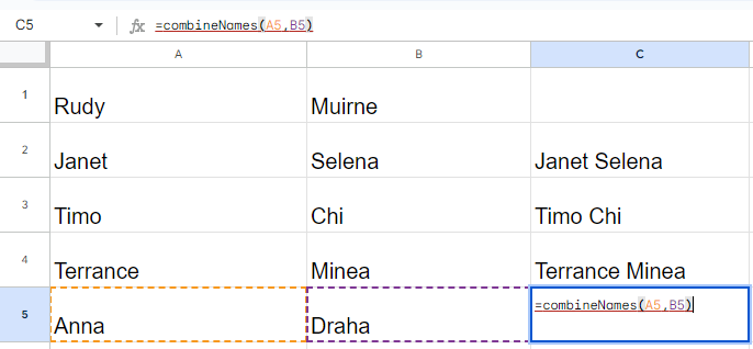 Back in your Google Sheet, use the new function you just created by typing: =combineNames(A5, B5).