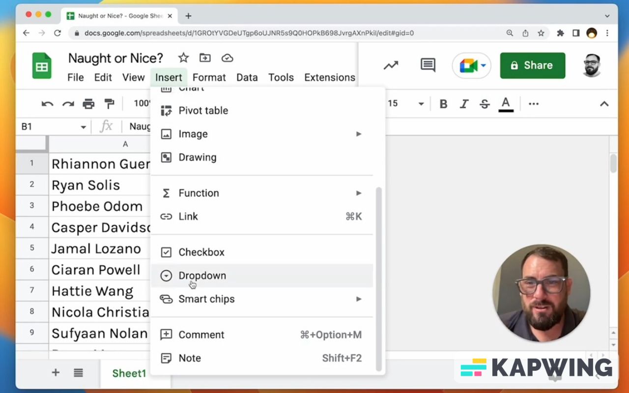 If you don't want to type in naughty or nice to a list of names, you can use now Google Sheets new dropdown interface in order to select this.