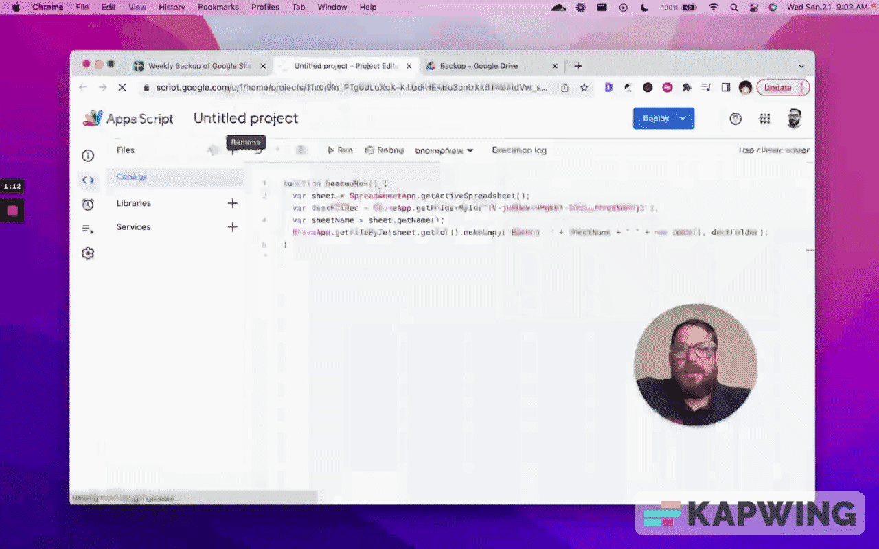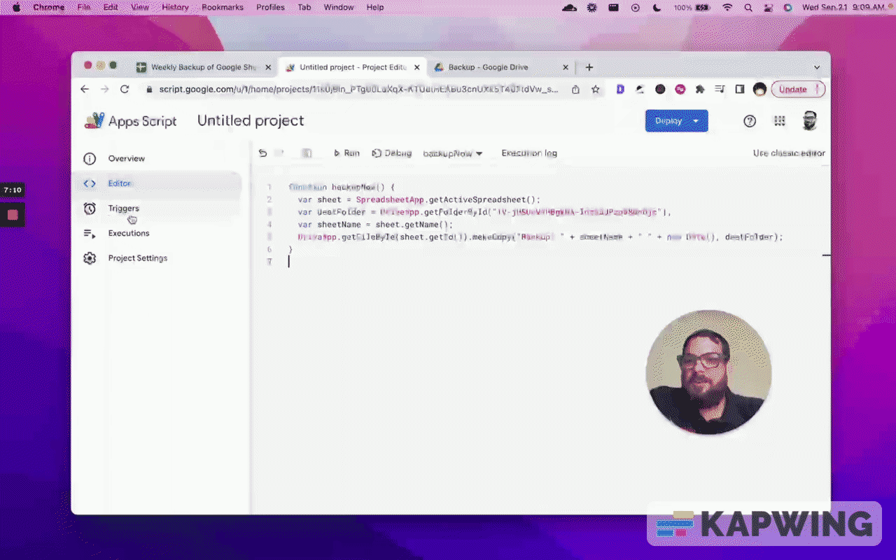 We want a weekly backup. We don't want to have to go in to Apps Script and click run. We're going to create a trigger.