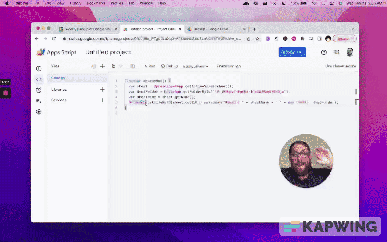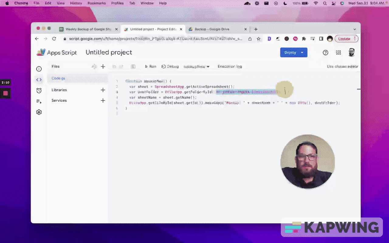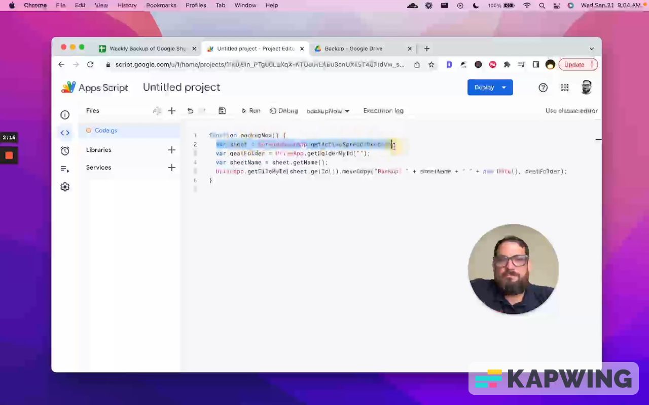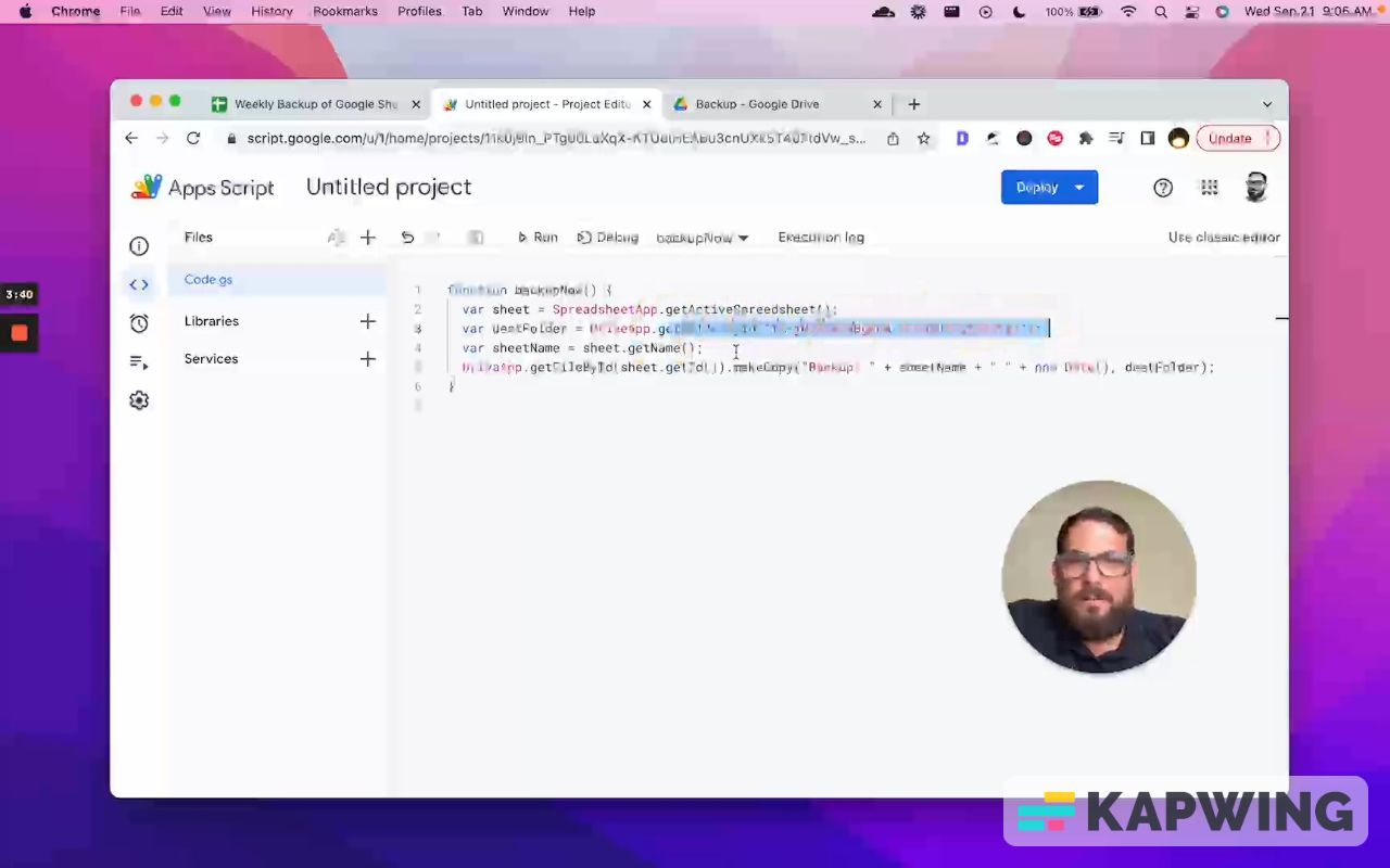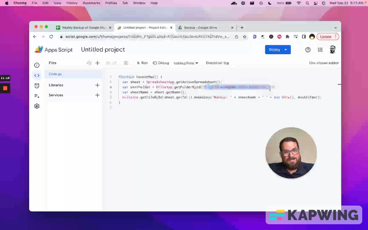 So a backup of your sheet is not really like an actual backup. What we're doing is we are creating a copy of your sheet as it is now, saving it to a Google Drive folder, and then we're going to set the script that I wrote already. We're going to set a trigger for it to happen every single week.