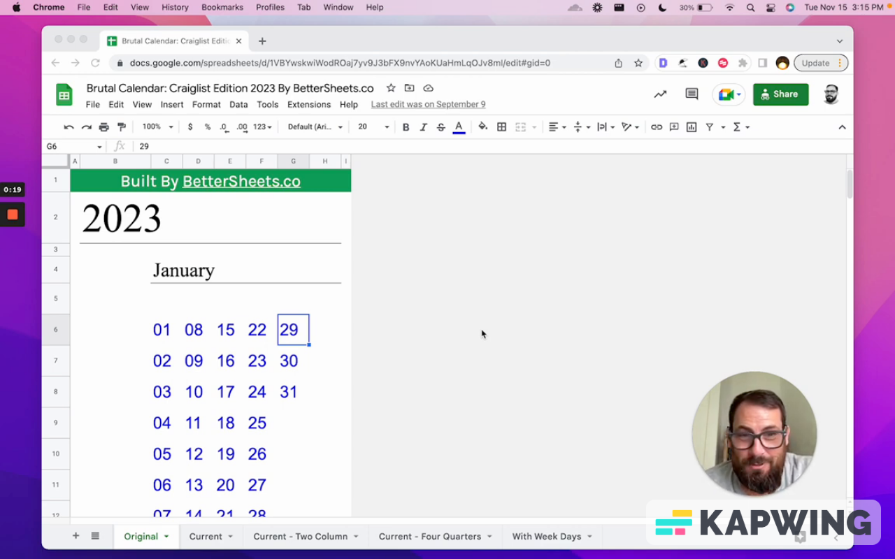 When creating a calendar in Google Sheets, I will typically recommend seven columns. Just create seven columns, like four or five, five or six rows, and set up a calendar that looks like that. Not that I got bored of it, but I just thought, “Well, there are different ways to show a calendar.”