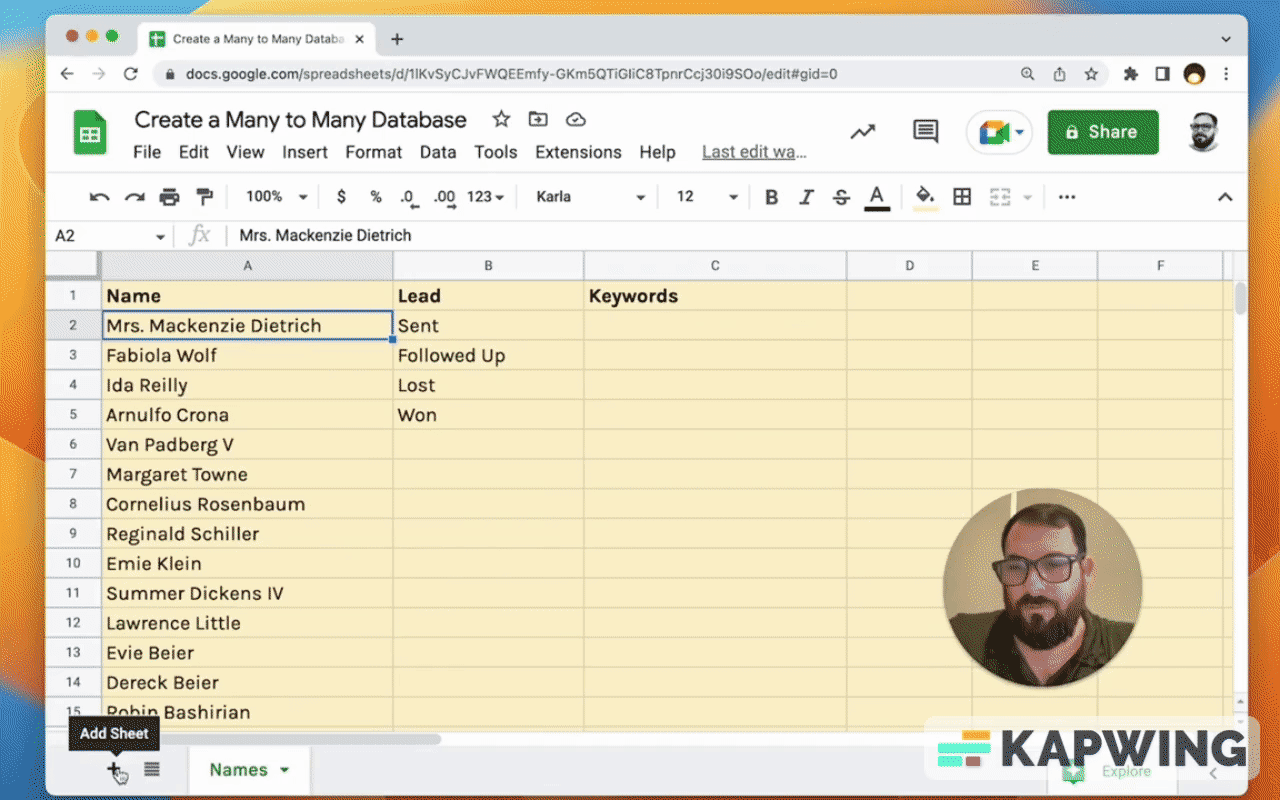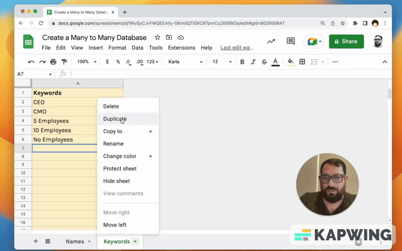 First off, we're going to create a duplicate of this sheet, “Names.” And instead of names, we're going to call this new duplicate “Keywords.”