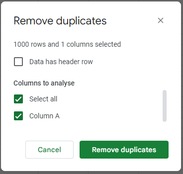 - Confirm removal: Click "Remove duplicates" to confirm your action. Google Sheets will remove any rows that contain duplicate values in the selected columns.