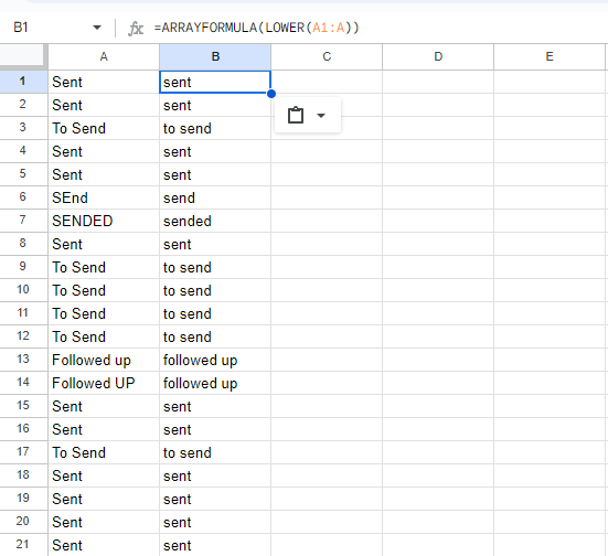 LOWERfunction down the column, you can useARRAYFORMULAto apply it to the entire range in one step:=ARRAYFORMULA(LOWER(A1:A)). This will automatically convert all entries in column A to lowercase.