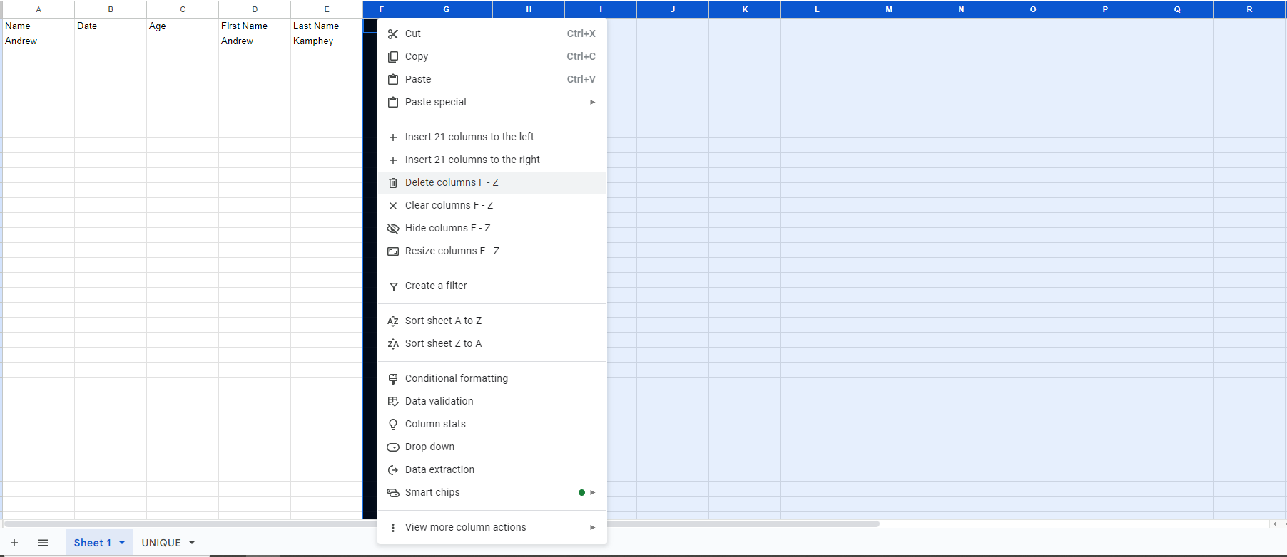- Select the unrelated column (e.g., the "Unique Names" column).