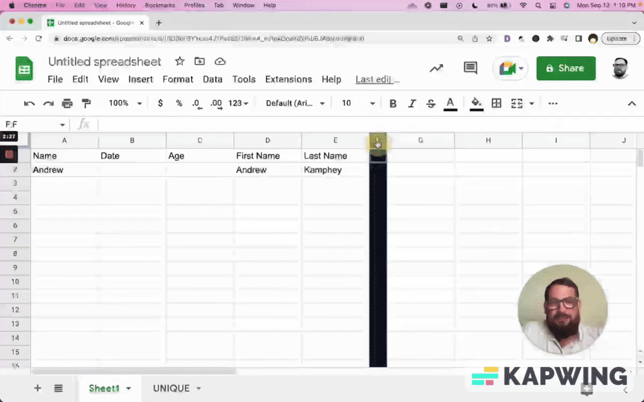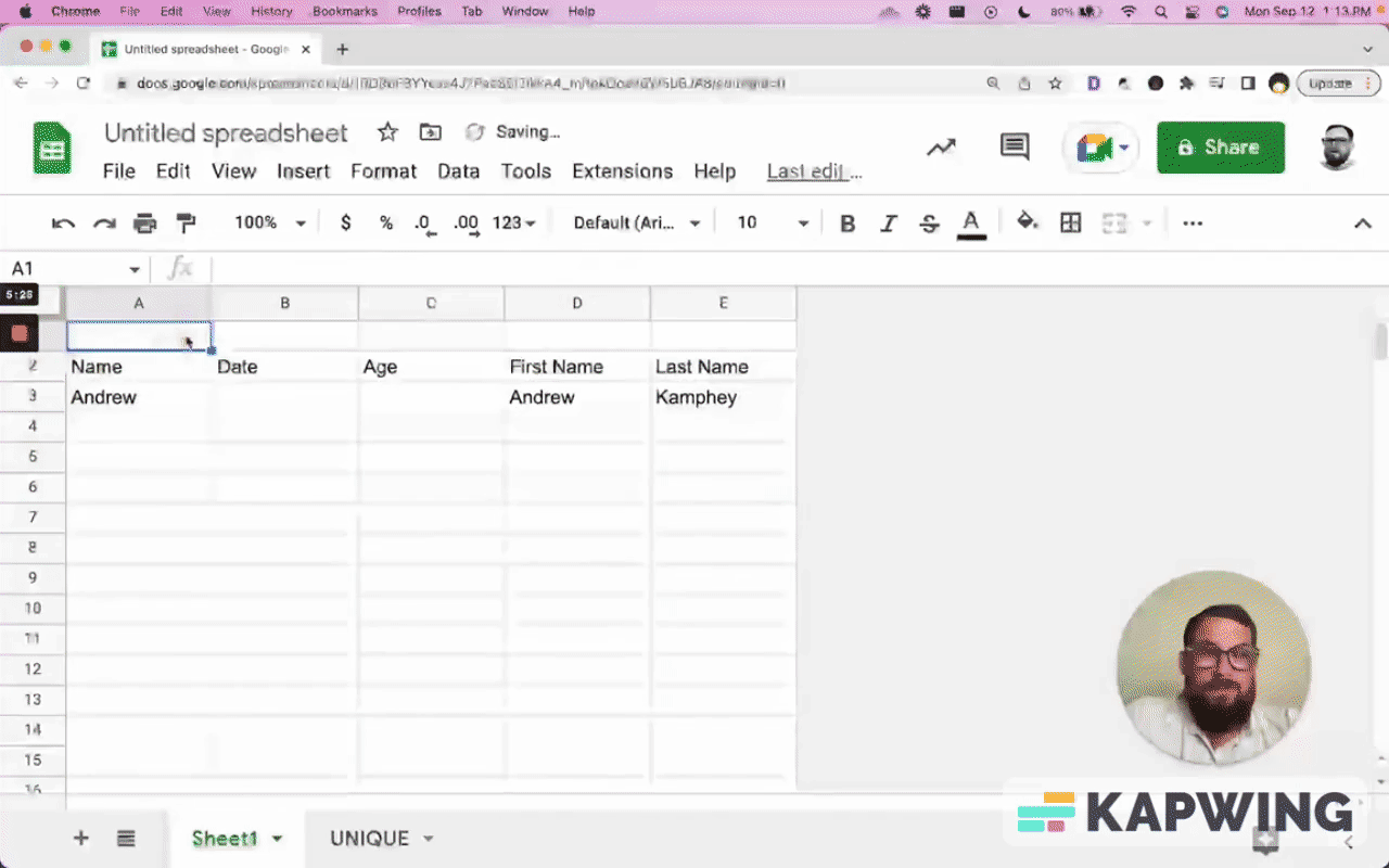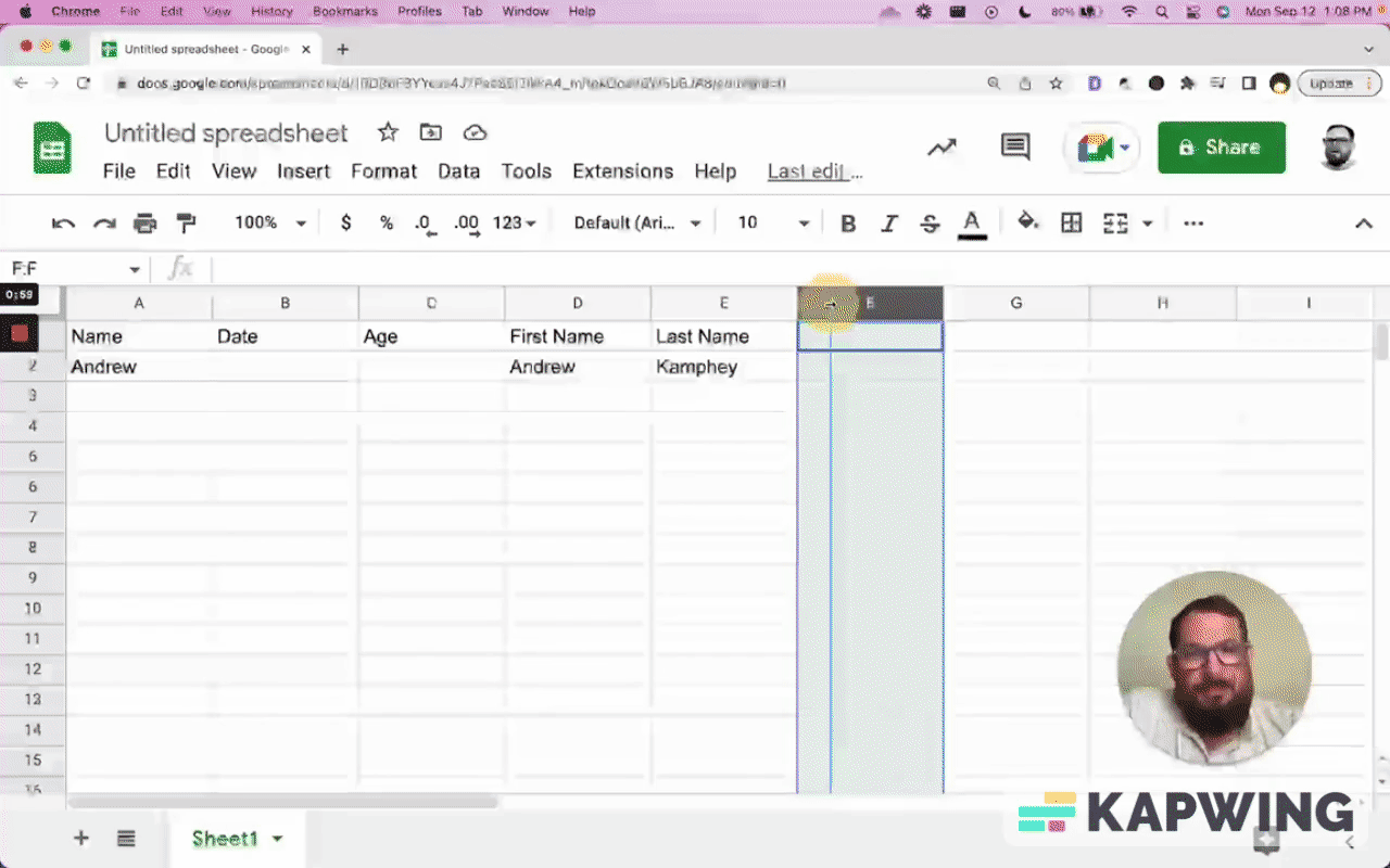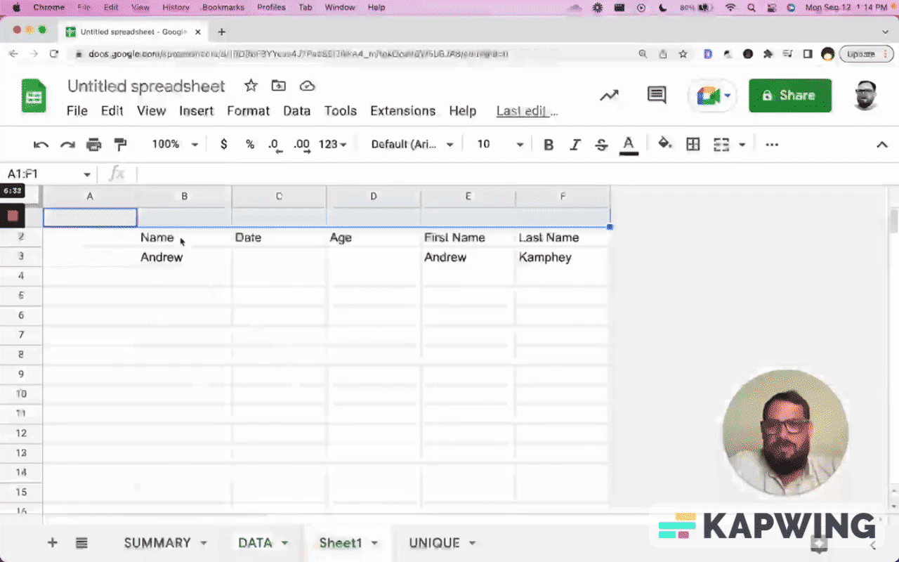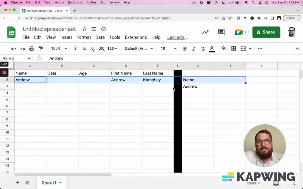We're in a spreadsheet where you might have some data, like name, date, age, first name, and last name. And you fill these in.