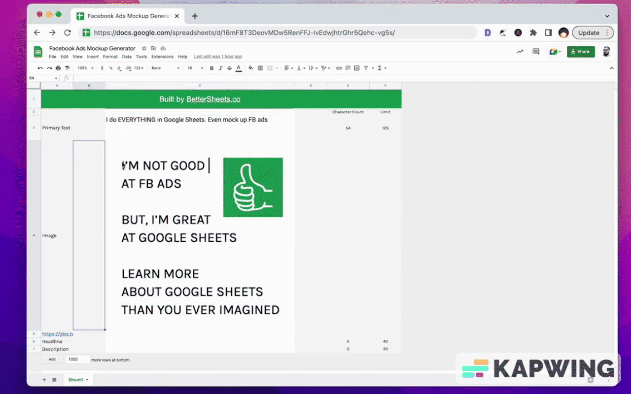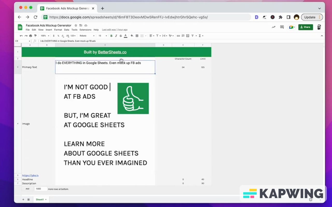 Create mock-up Facebook ads with a unique character count formula. Master Google Sheets with free tools, tutorials, and templates!