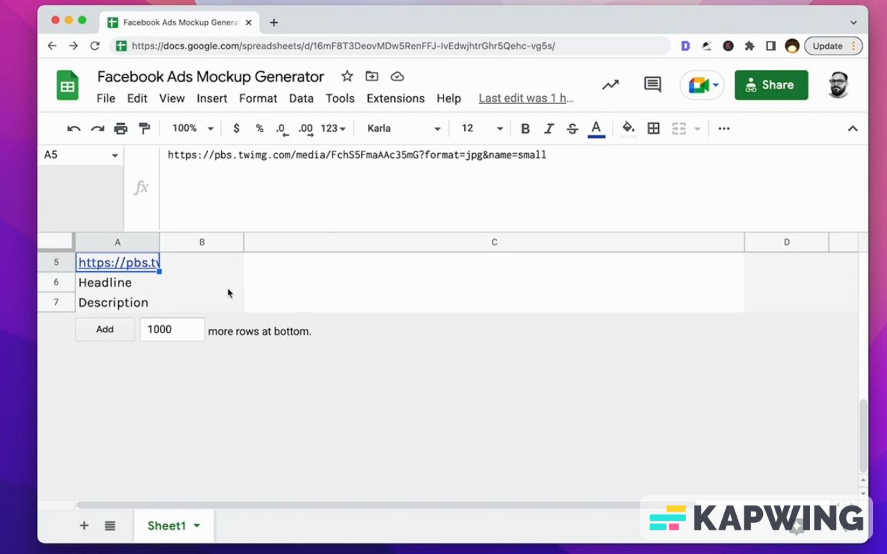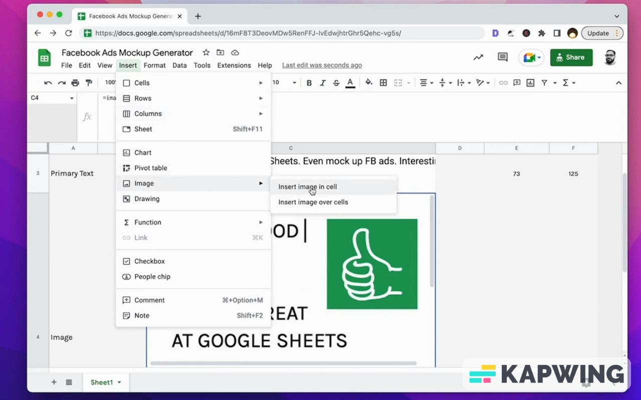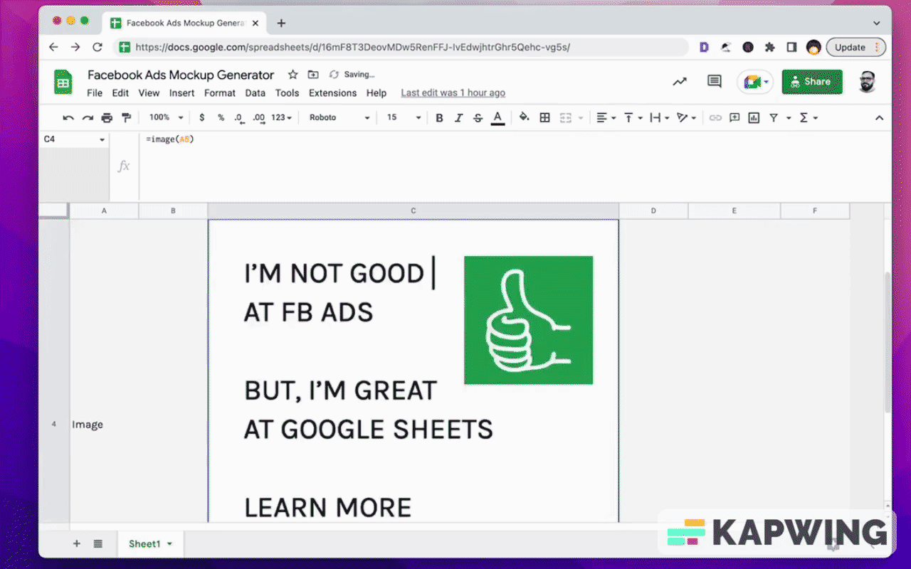 And then the image: Just use the image formula here again. You can also insert an image in the cell and you can mock up your Facebook ads there.