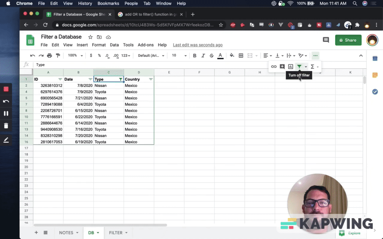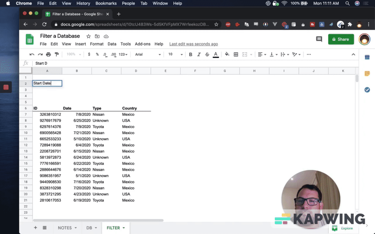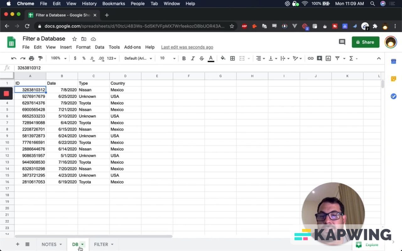 First, have to have a database on a separate tab so that you can filter. I've created that tab. I've also created IDs so we know what we're getting.