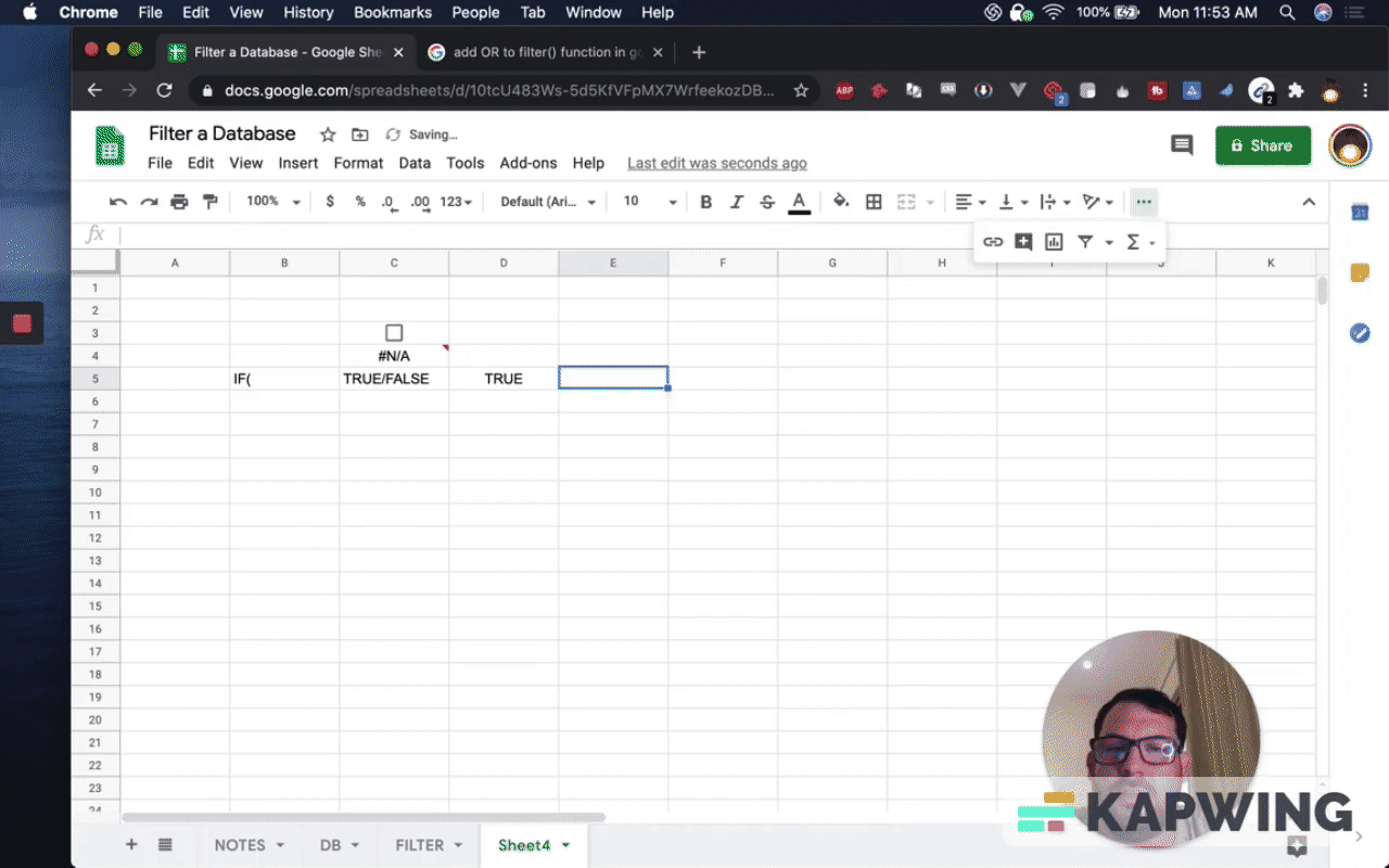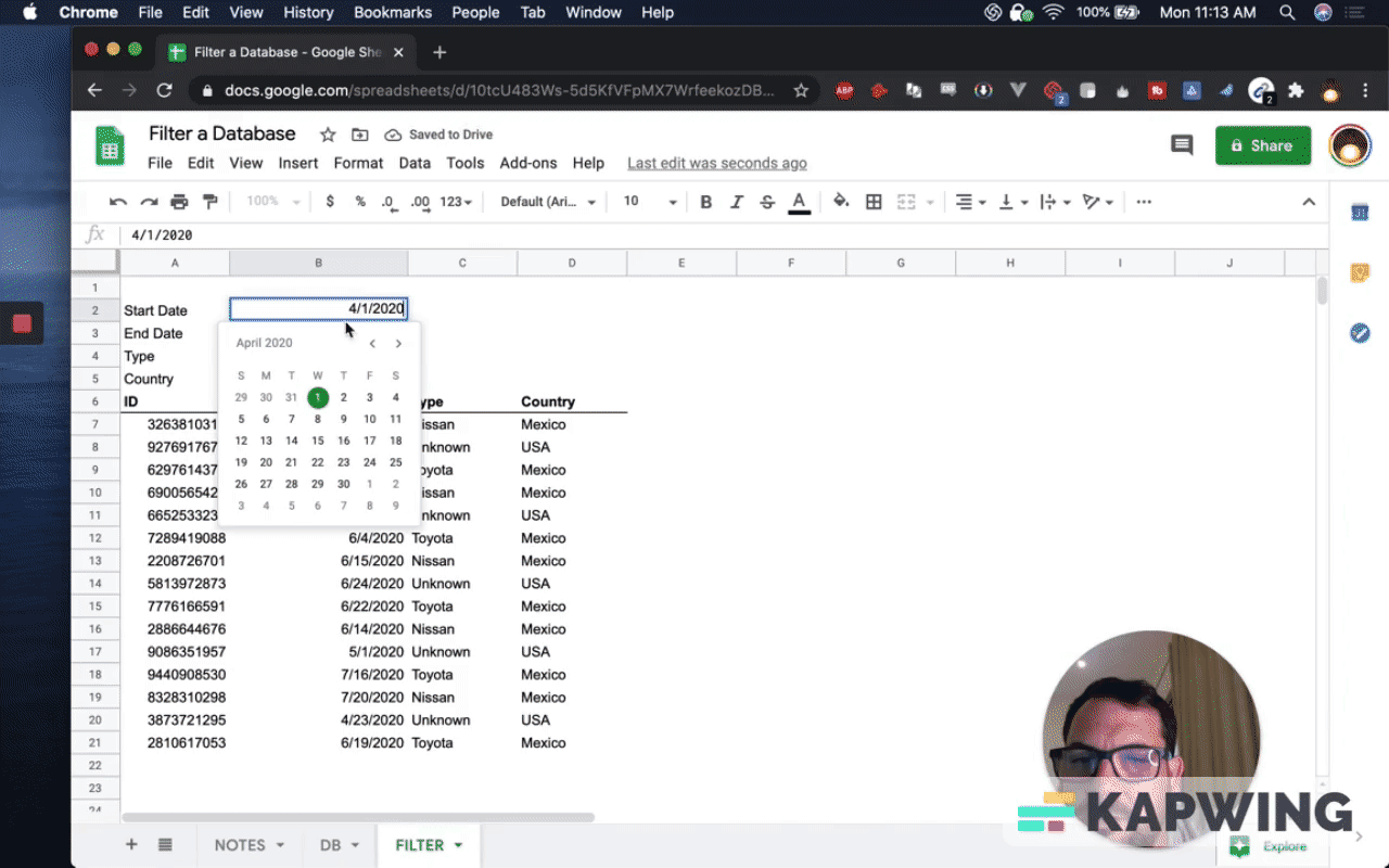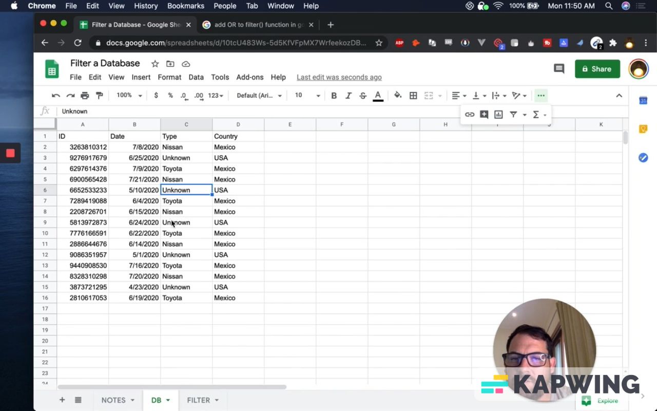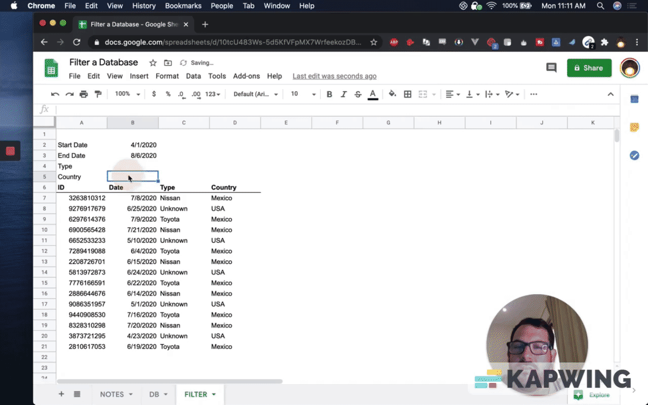 First, have to have a database on a separate tab so that you can filter. I've created that tab. I've also created IDs so we know what we're getting.