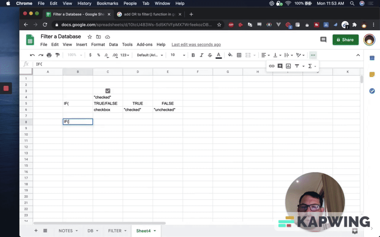 In B8, we start with IF( and then use our checkbox with TRUE/FALSE in C8.