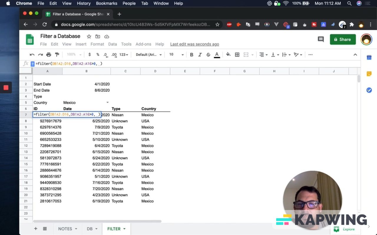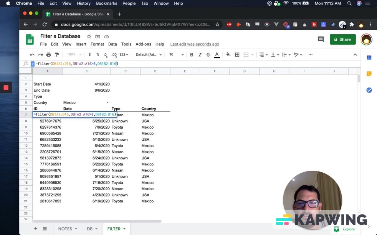 =filter(DB!A2:D16,DB!A2:A16>0)We’re going to get everything for this formula to work. We need to filter something. We want everything under the ID column.
