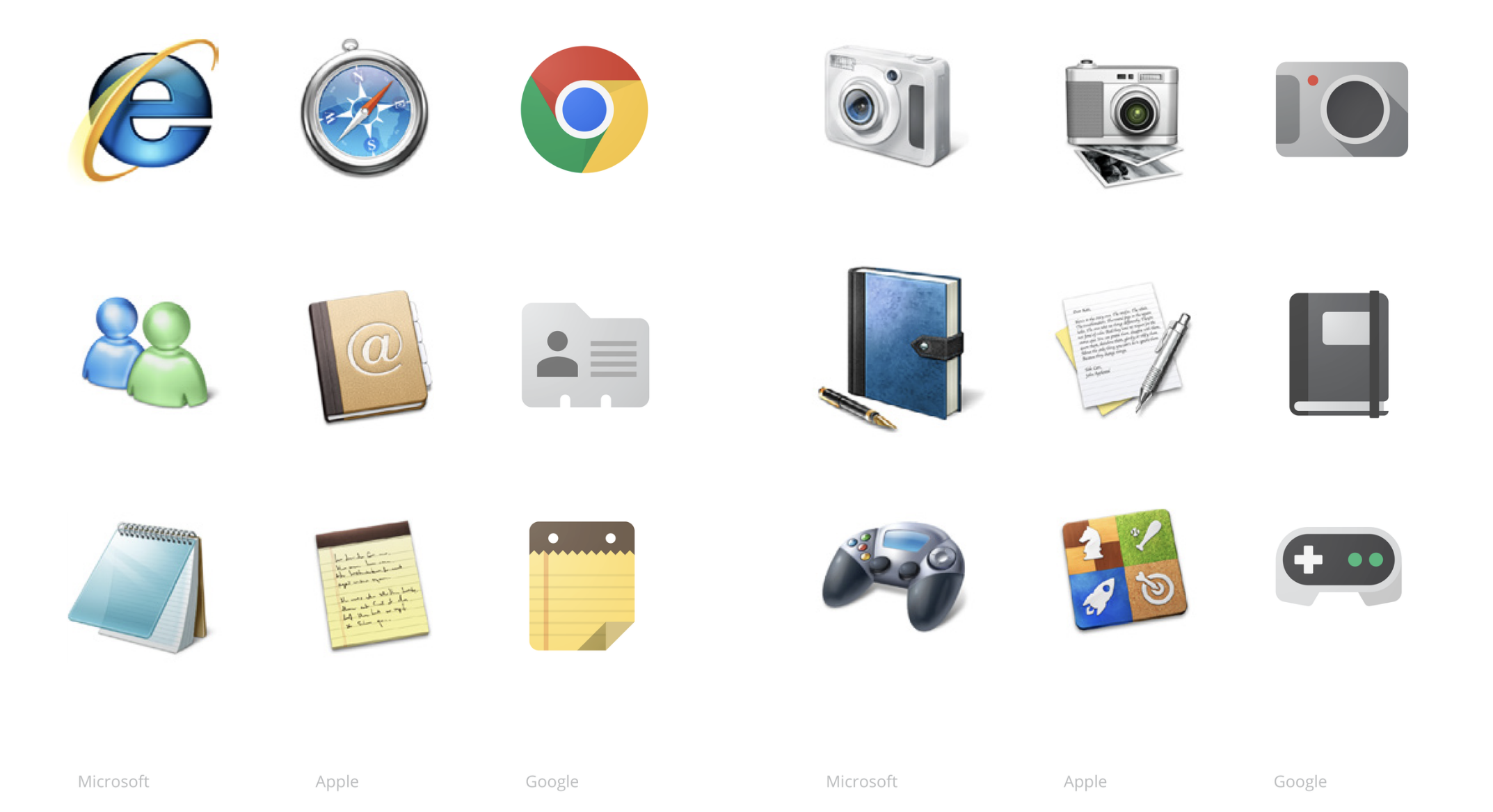 You can clearly see what Chris is talking about when you compare Google's design to Microsoft and Apple at the time. The bold colors jump out at you. The design is unique among their competitors. Apple and Microsoft sharing similar outputs, while Google is bold and simple.