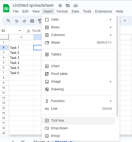 - In the next column (column B), go to Insert > Checkbox. This will add a checkbox next to each task.