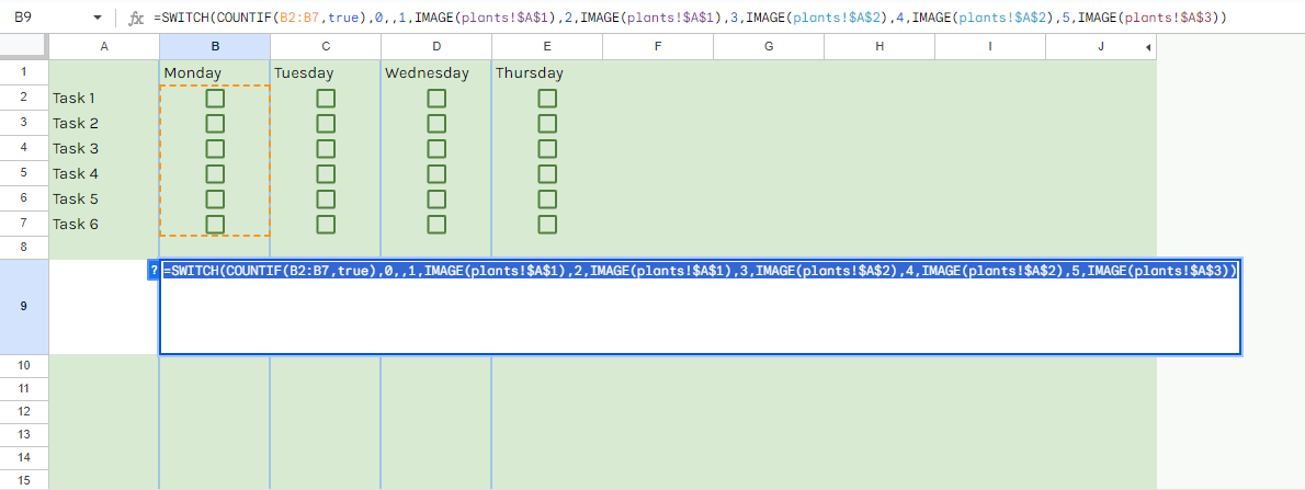 Now that we have the tasks and images ready, it’s time to set up the magic formula using SWITCH, COUNTIF, and IMAGE.