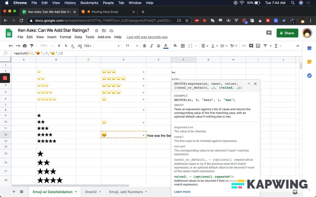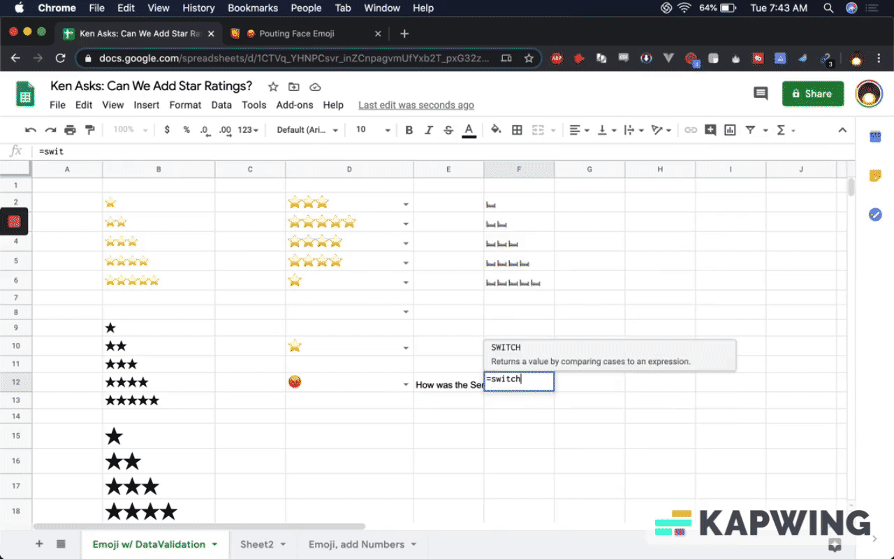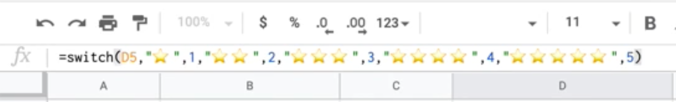 Copy and paste the star emojis in D4-D6 and then type in the switch formula.