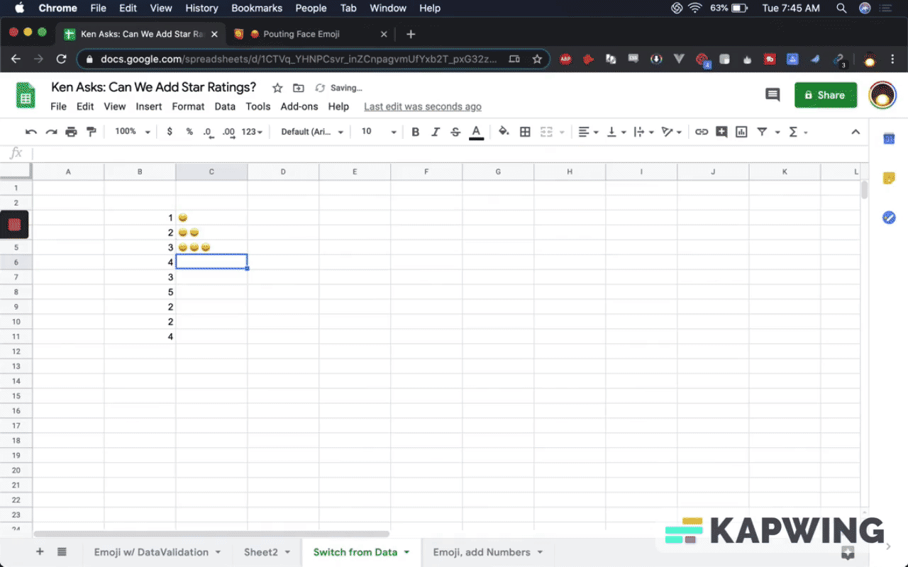 Why I wanted to answer it in this way with data validation and emojis is because it actually adds a really cool element of reading star ratings to our lists or any kind of data we're trying to get from other people. Maybe we're doing a survey or something. Maybe you want to show some kind of rating system and it could be stars. It could be any emoji. I used emojis here and used a data validation to give you a dropdown.