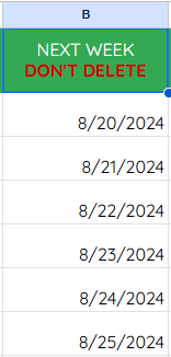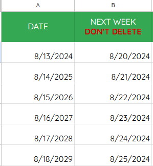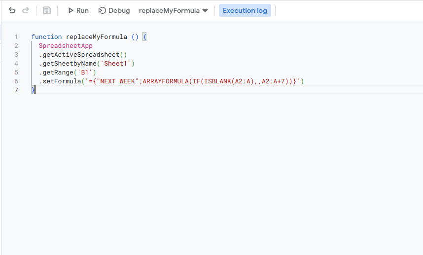 .setFormula('={"NEXT WEEK";ARRAYFORMULA(IF(ISBLANK(A2:A),,A2:A+7))}