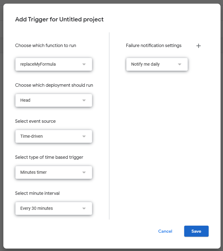 - Save Your TriggerWith this setup, if anyone accidentally deletes your formula, it will automatically reappear within the time interval you set (e.g., 30 minutes). You can adjust this as needed, but keep in mind that more frequent triggers might slightly affect sheet performance.