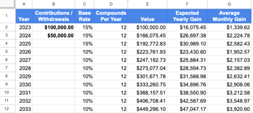 I wanted to project my potential gains in the coming years, but I wanted to display each year on a separate row. This way, I could get a sense of how much I would be gaining per month and year.