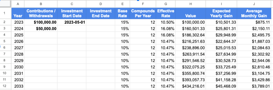 So I added in columns for my investment start date, a potential withdrawal date, and added an extra column for the resulting effective rate.