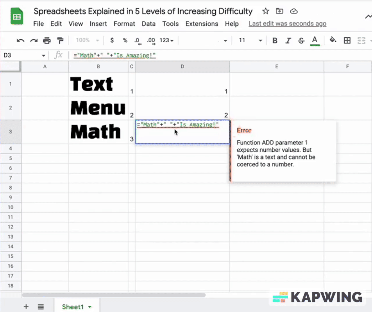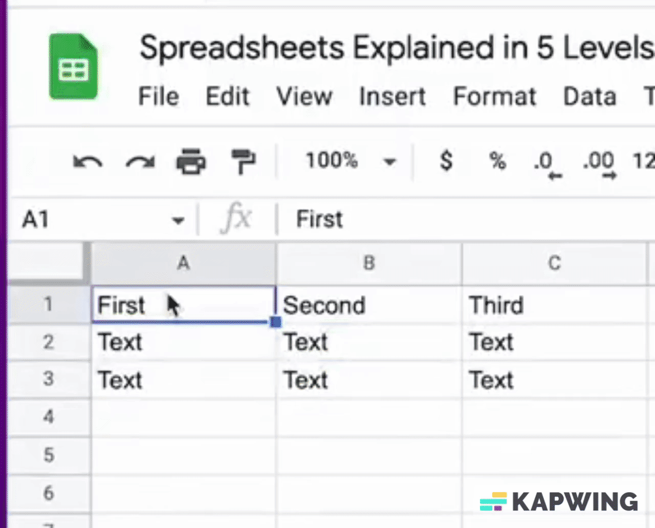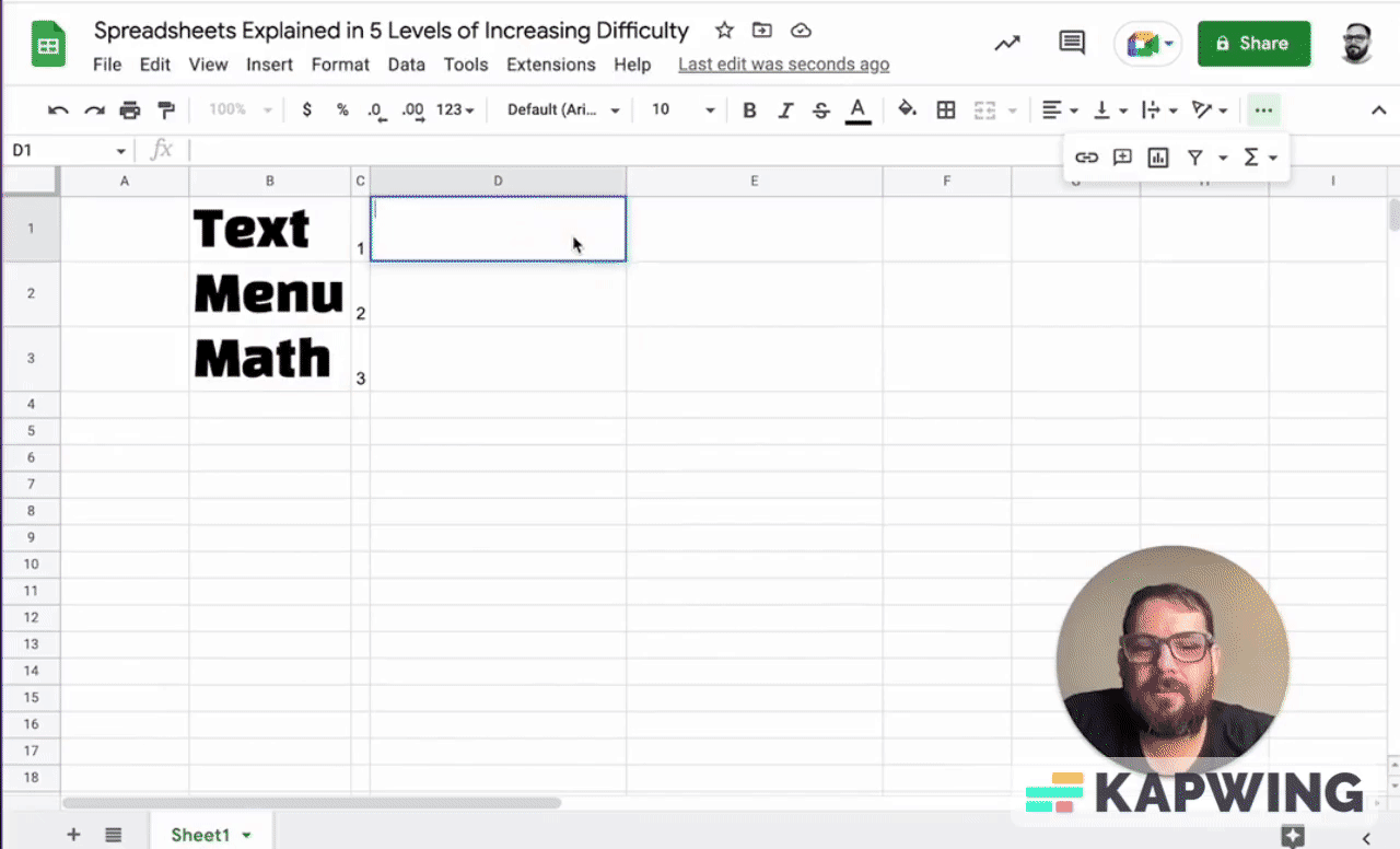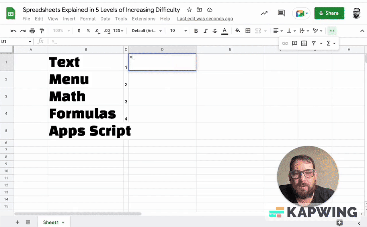 Five increasingly difficult ways of explaining spreadsheets in Google Sheets: The basics of Google Sheets text Menu items in Google Sheets Math inside Google Sheets Using Formulas in Google Sheets Apps Script in Google Sheets