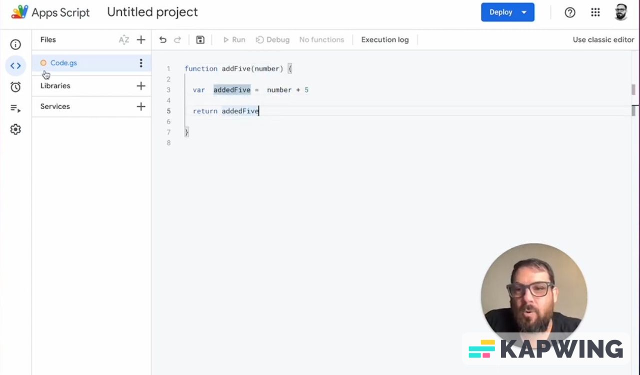 Inside of App Script, we can name and create our very own functions, such as addFive.