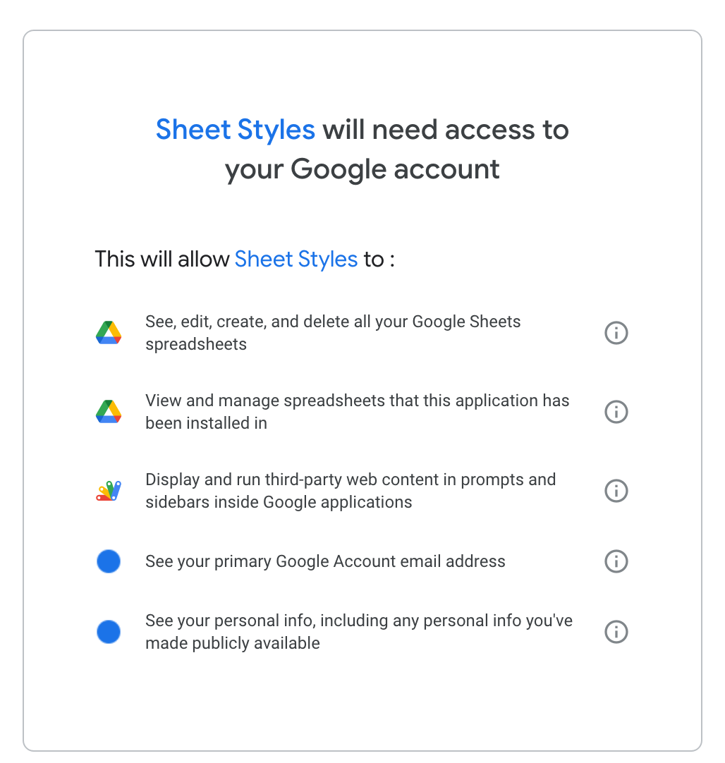 There are certain permissions that Sheet Styles needs you to grant in order for Sheet Styles to work properly. It first needs to be able to edit your sheets, and then manage your spreadsheets. In order to have a sidebar, Sheet Styles also needs ot be able to display third-party web content in sidebars.