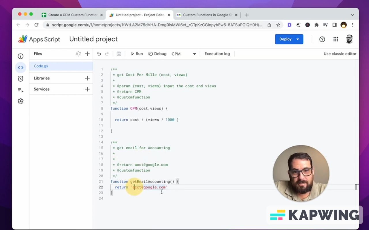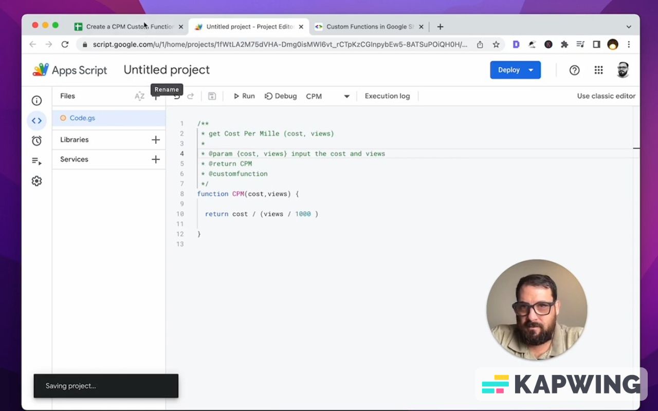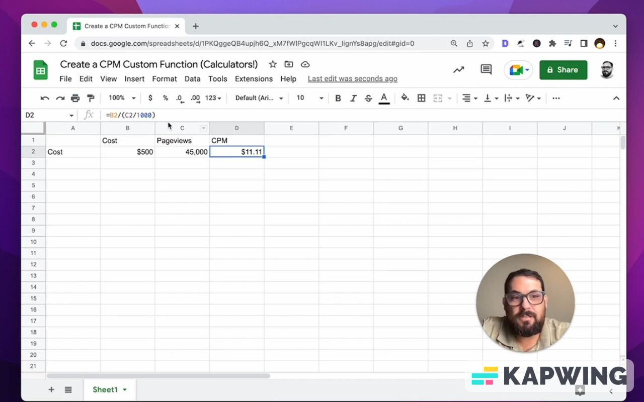 CPM is a fairly common calculation. This is really good to abstract away the math and be able to check it. If you do know to how to get to Extensions --> Apps Script, there's one other thing that we want to clean up.