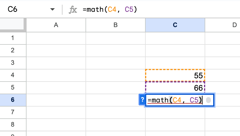 - Enter data in the sheet: In your Google Sheet, enter two numbers in cells C4 and C5, such as 55 and 66.