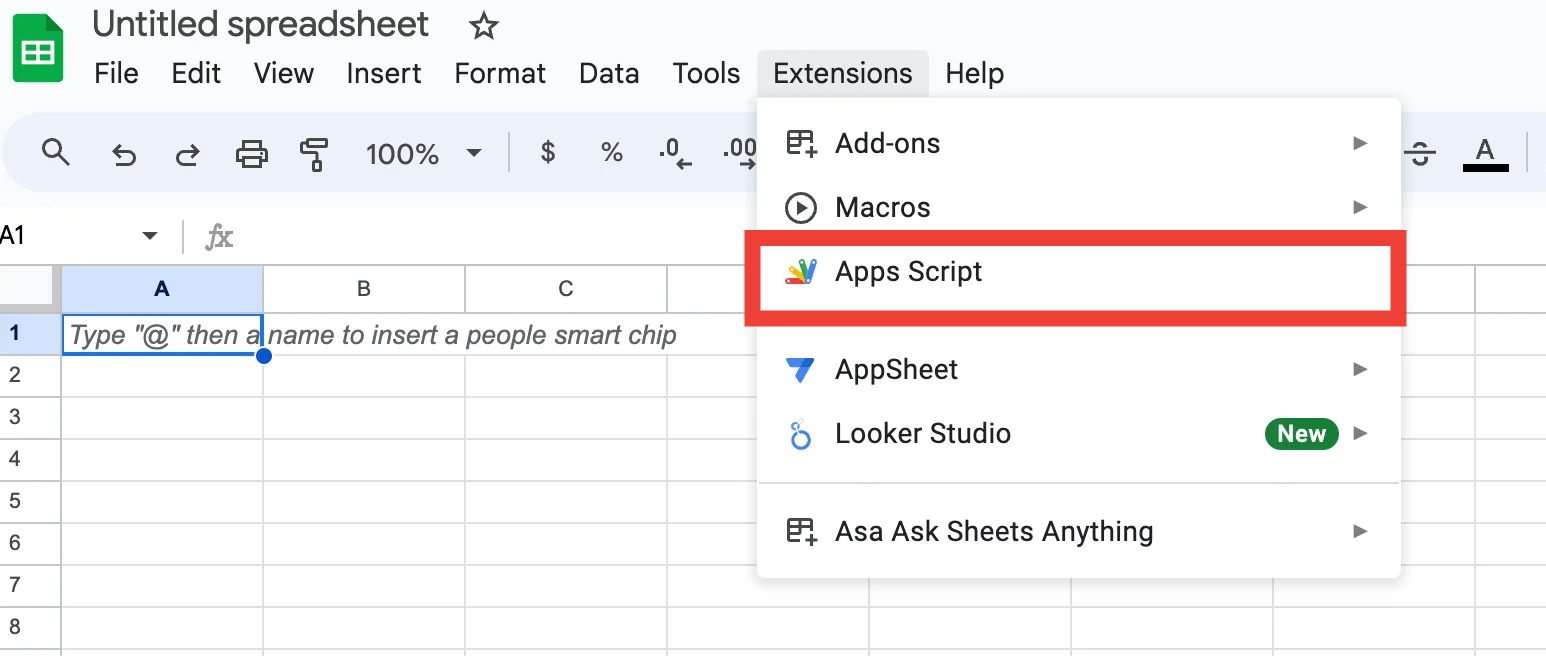 - Select Apps Script: Click on "Apps Script" from the dropdown menu. This action will open a new window where you can write your code.